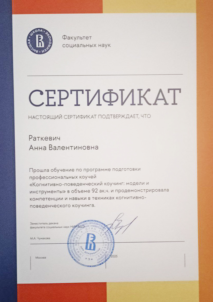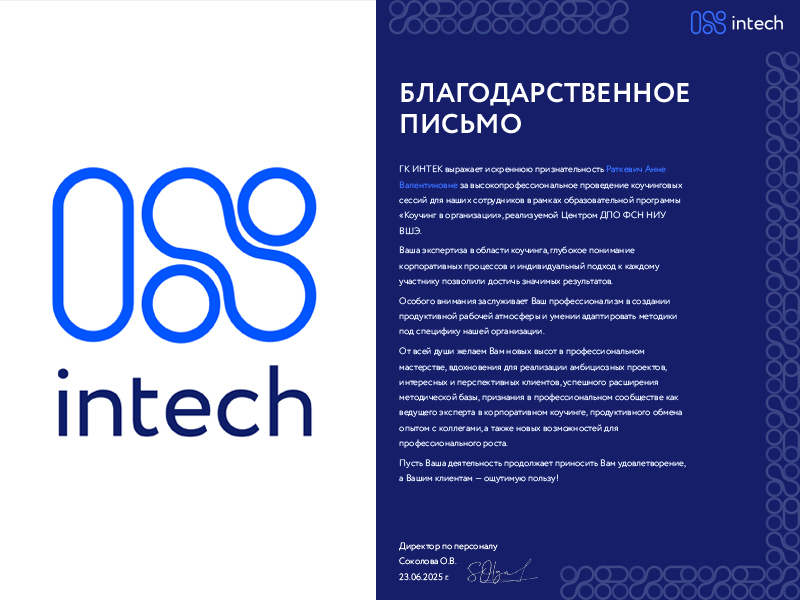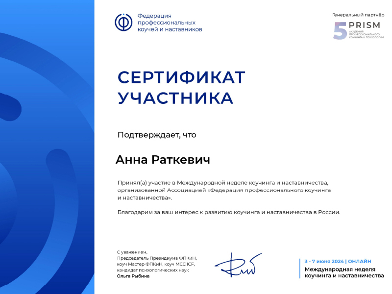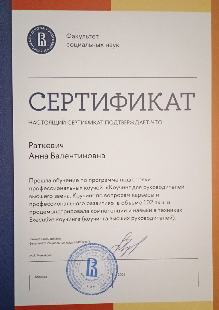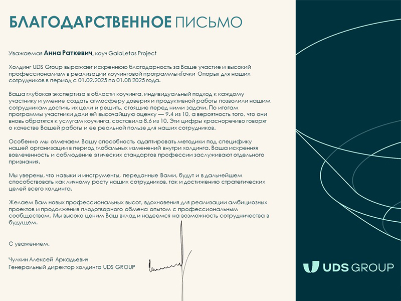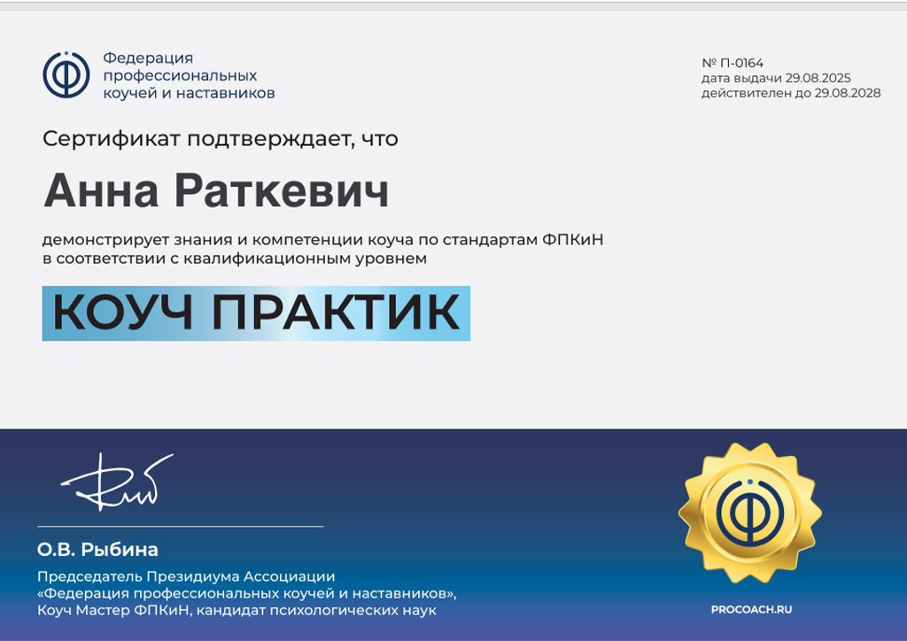 Начну с результата, потому что, могу предположить, что это самый главный критерий при выборе коуча. Я профессиональный директор по персоналу, который способен выстроить стратегию и привести к задуманному результату, я способна держать долгую цель – и сегодня я это говорю уверенно, я достигла поставленных результатов в работе, я могу оцифровывать не только мою деятельность, но и личную жизнь, и самое главное – я понимаю, что я хочу, какой я делаю выбор, и какие решения я принимаю и несу за это ответственность. Я могу спокойно хвастаться моими успехами – и это только частично моя заслуга, потому что это как раз и есть результат совместной работы с моим коучем Анной Раткевич. Аня для меня стала внешней опорой и поддержкой, пока она не научила меня находить мои сильные стороны и быть сильнее самостоятельно без нее. Вы спросите, почему тогда я еще с ней в работе? Да потому, что нет предела совершенству, это раз, два, я могу с коучем решать не только профессиональные вопросы, но задачи личностного характера, я практически уверена, что мне есть куда расти. Для меня коуч сессия – это возможность увидеть реальность под другим углом, все чаще я учусь с Аней делать это самостоятельно, но иногда просто жажду услышать ее верное «позволишь, я тебе верну») Конечно, Аня, позволю и сделаю это с удовольствием)